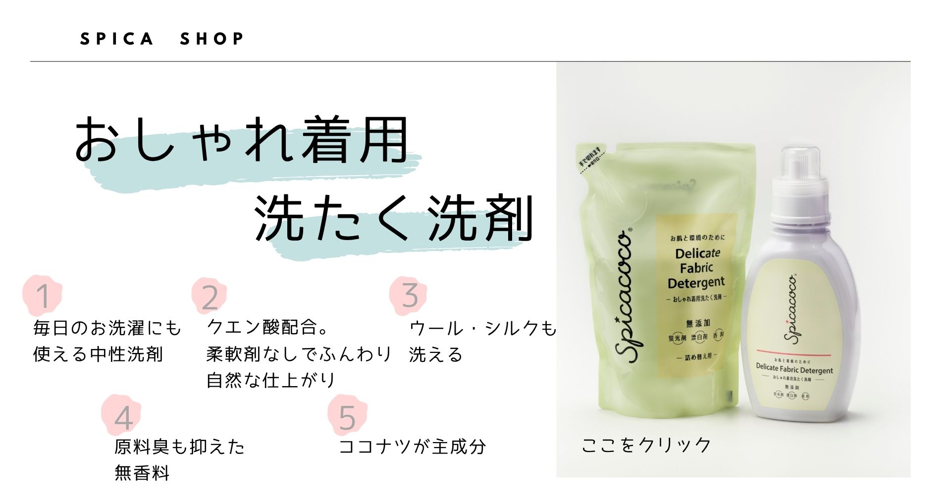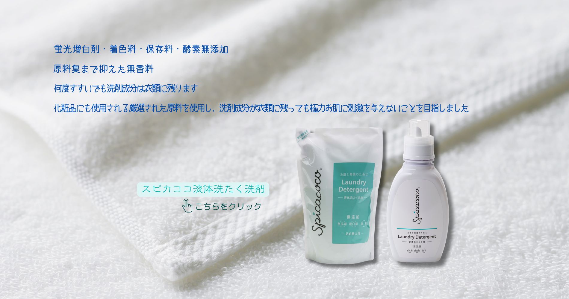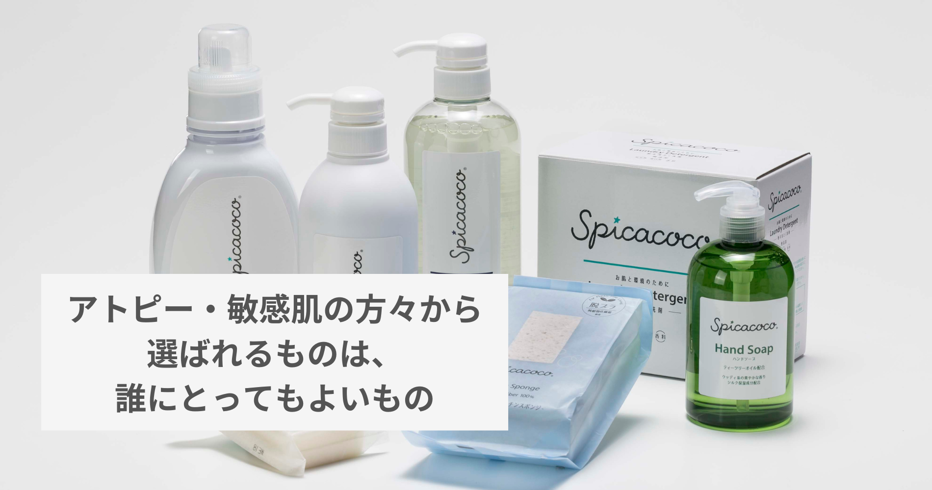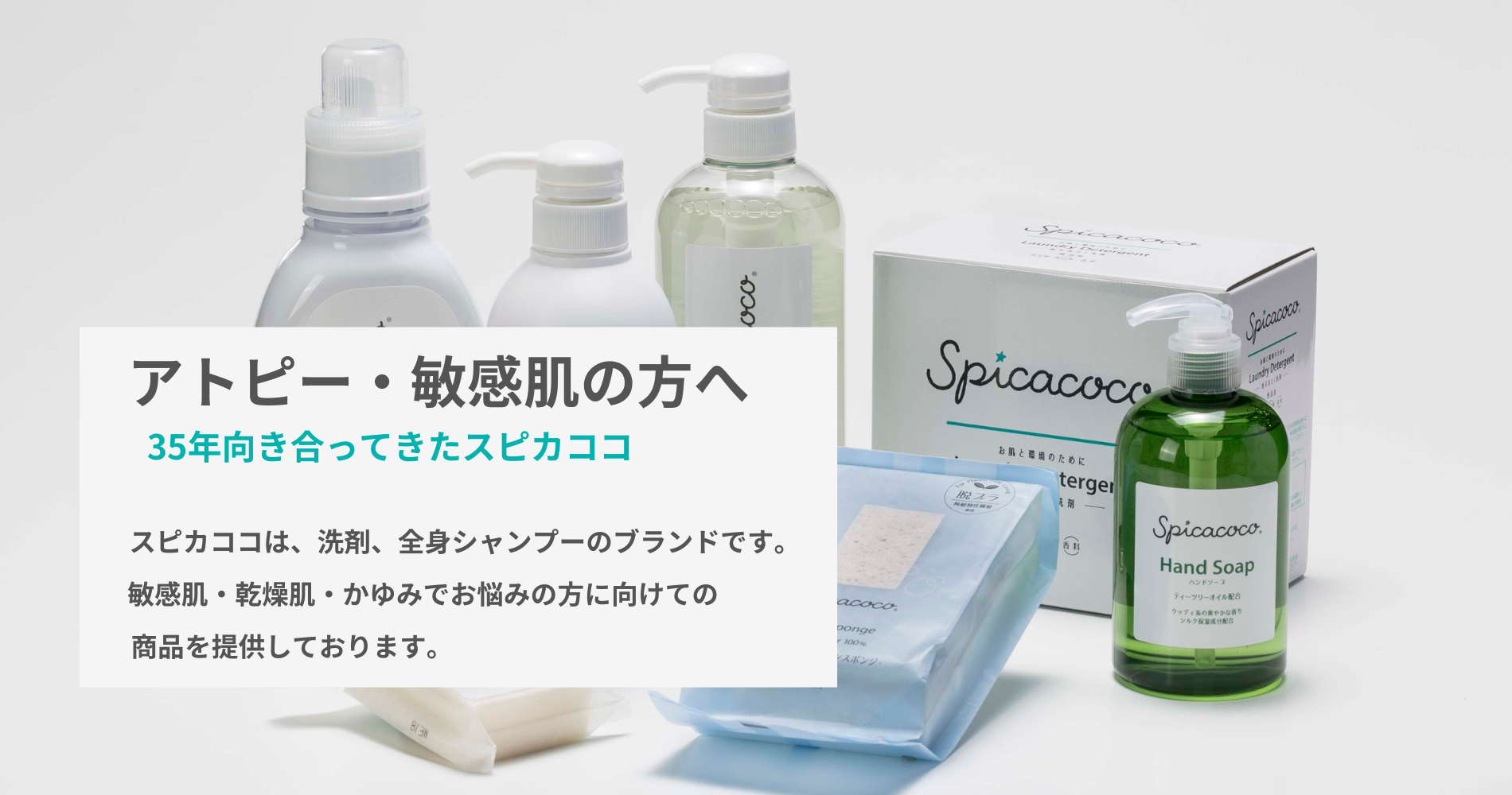 現在、「オーガニック製品」は世に溢れていますが、スピカココは「オーガニック」を売りとしているわけではありません。あくまで、アトピーや敏感肌でお悩みの方が使いやすく、少しでも悩みを解決できるものとして製品に想いを込めています。これからもスピカココでは「洗う」のトータルケアを提唱してまいります。衣類、食器、そしてお肌と髪。別々の事に見えても私たちの肌に実は密接に関係があります。一度生活すべての「洗う」を見直してみませんか。