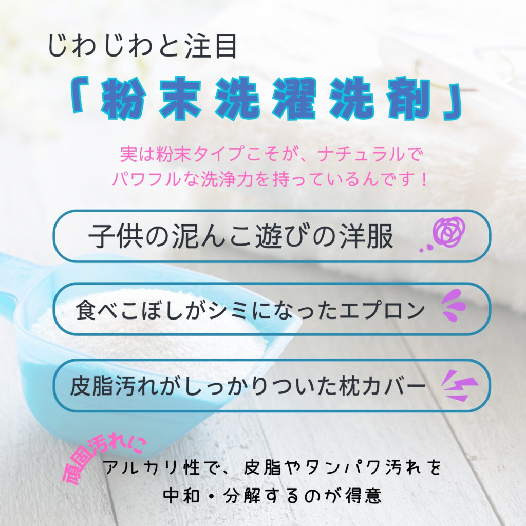 えっ、粉末洗剤?なんだか古いイメージ…という声も聞こえてきそうですが、実は**肌にやさしくて、しかも洗浄力もバツグン!