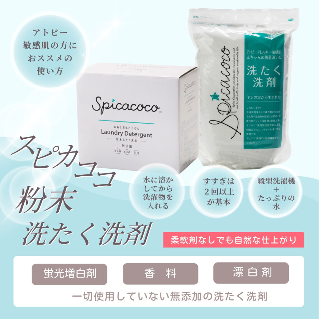 また洗剤残りが少なくお肌にやさしいスピカココの粉末洗たく洗剤はお肌に敏感な方に最適な洗剤です。