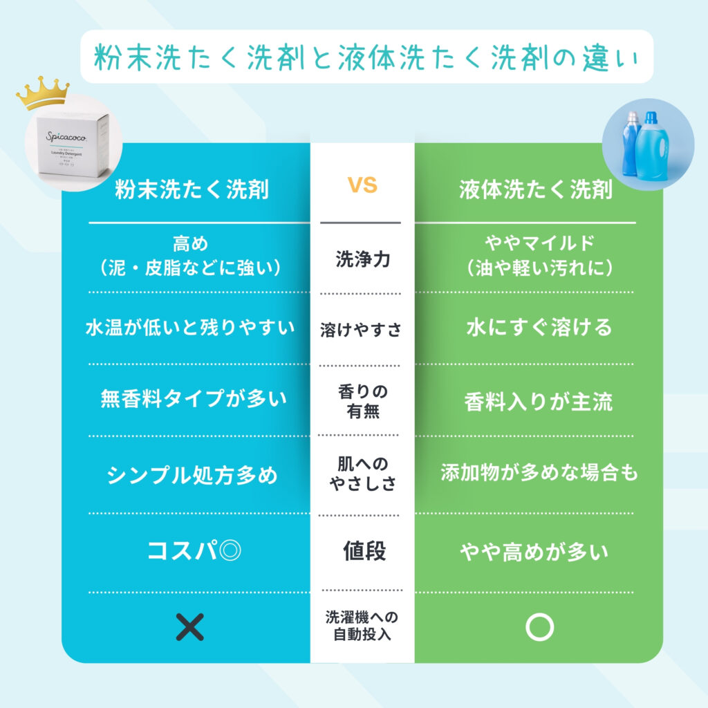 ここで、粉末洗濯洗剤と液体洗濯洗剤の違いを簡単にまとめてみましょう。