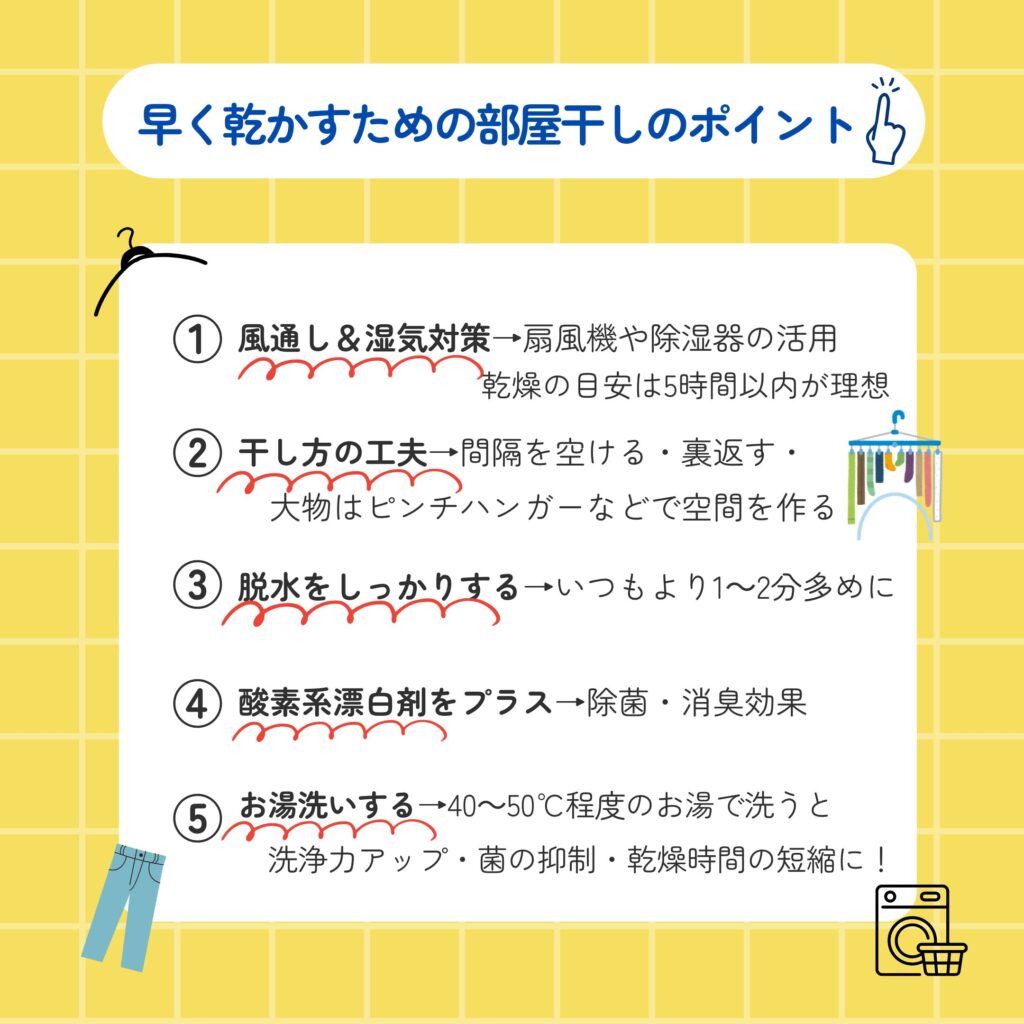 このようなポイントを押さえることで、部屋干しの効率がグッとアップします。